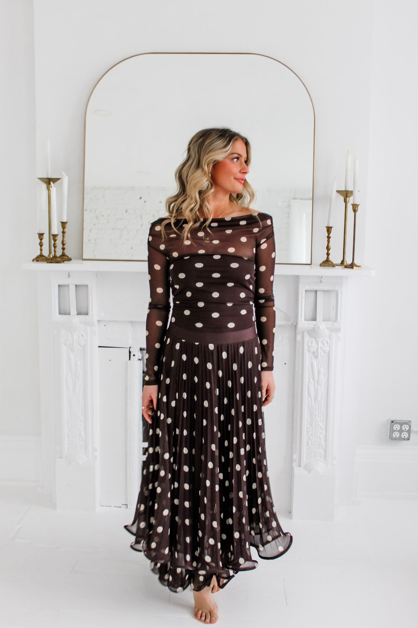 The Lainey Mesh Bodysuit is the perfect mix of playful and polished. Designed in a sheer mesh fabric with a classic polka dot print, this off-the-shoulder silhouette creates an effortlessly flattering neckline while the fitted shape hugs in all the right places. Lightweight and stretchy, it layers beautifully while still making a statement on its own.